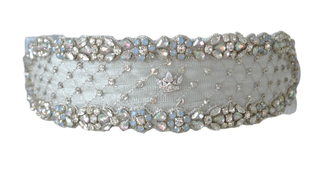 This front of this garter is made using a beautiful mixture of sparkling iridescent, clear, and blue opal rhinestones. At the center of the design is one crystal tiara pendant with silver-set detailing. If you look at the back side, you will notice that the outside is made of a glistening, Cinderella blue organza fabric, reminiscent of Cinderella's iconic blue ballgown. For a touch of sparkle, you will see that hand-placed twenty sparkling swarovski rhinestones along the back band. Our favorite part? The inside of the band is embroidered with the phrase "Have Courage and Be Strong" in the same signature Cinderella Blue that the back band features.  Please note: this is a limited-edition design. We currently have only 18 of these in stock. (as of January 10th, 2020)